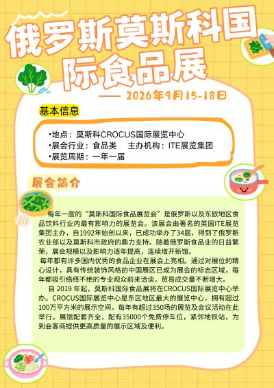 展会时间:2026年9月15-18日 展出地点:莫斯科CROCUS国际展览中心 组展单位:福建荟源展览有限公司 展会行业:食品类 展览周期:一年一届